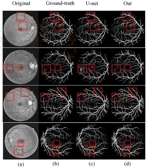 In order to more intuitively compare the improvement effect of the U-Net model and the segmentation performance of blood vessels, this study compared a variety of deep learning methods including U-Net model. In general, compared with the original U-Net model, the MRU-Net model has less noise points in the vessel probability map. From the details, the results of this study can better segment the small vessels and retain the integrity of the vessels, and the continuity of the vessels is better. In order to observe the influence of lesions on vascular segmentation more intuitively, by comparing with the experimental results of the original U-Net model, it can be seen from Figure 10 that the MRU-Net network proposed in this study can better segment blood vessels and is less affected by the lesion area. Compared with other methods, it can be seen from the detection indicators that our method achieves an optimal effect in three indicators of F1, SE, and Jaccard in the DRIVE dataset and that the AUC index is only slightly lower than that in the literature []. Although the ACC index is better than most methods, it needs to be improved. In the STARE dataset, our method achieves the best results in AUC, F1, and Jaccard; the ACC index is only slightly lower than in the literature [,]; and SE is slightly lower than in the literature [].