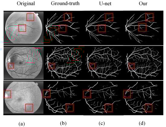 Comparison of DRIVE segmentation results: (a) original image, (b) ground-truth, (c) U-Net segmentation results, and (d) MRU-Net segmentation results.