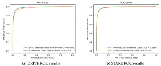ROC curve: (a) DRIVE ROC results and (b) STARE ROC results.