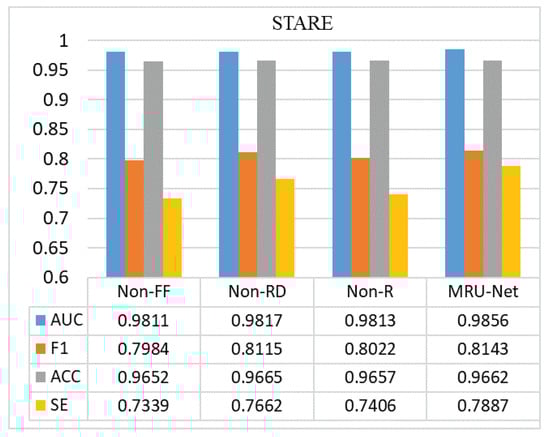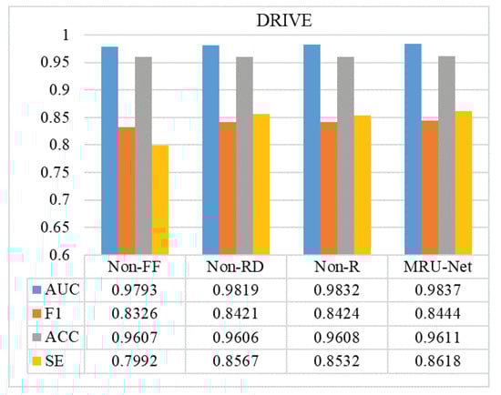 In order to explore the improvement effect of the model, the experimental results of different model structures were compared and analyzed, aiming to explore the influence of the improvement of each module on the experimental model. As shown in Figure 13 and Figure 14, Non-FF indicates the experimental results without feature fusion, Non-RD refers to the experimental effect without the Res-Dilated module, and Non-R refers to the experimental results without the Resnet module for encoder and decoder. Through the comparison of experimental results, it can be found that adding feature fusion module can effectively improve the sensitivity (SE) of model segmentation and that the fundus image can be more detailed and effective segmentation; the addition of the Res-Dilated module and Resnet module can reduce the semantic gap between encoder and decoder and effectively improve the transmission of features and reduce the loss of features, so that the overall evaluation index of the model is also improved. On the other hand, although the Resnet and Res-Dilated methods can improve the model, the most significant improvement is the addition of the feature fusion method. Because the size of blood vessels in fundus retinal images is different, the motivation of multi-scale information fusion design is to use different expansion rates to capture multi-scale features, so it can effectively retain the information of microvessels, thus improving the detection accuracy of vascular edges and microvessels. From the data point of view, the value of sensitivity (SE) has been significantly improved, which also reflects that the feature fusion method designed by us improves the segmentation accuracy of more blood vessels.