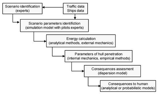 Several methods of maritime risk analysis dedicated mostly to coastal and open sea areas have been developed [16,17,18,19]. The general risk assessment framework of dangerous cargo terminals located in the vicinity of waterways in respect to possible collision is presented in Figure 2. The overall framework of formal risk assessment for shipping in coastal and open seawaters is presented by [20]. However, in the port area, several differences are observed. Firstly, in port areas, impacts are both generally minor and more likely. Secondly, there are human populations in the port areas that may be threatened by toxic substances released during a collision. The navigation process is also different—usually there are several persons on the bridge performing overlapping tasks (pilot, captain, OOW—officer on watch). The Vanem framework classifies the collision with a moored ship accident as one which could lead to misunderstandings, especially when analysing the causes of accidents. The proposed multi-stage procedure requires applying the following five sub methods: