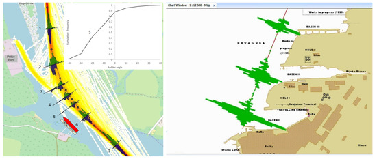 Distribution of ships traffic of length more than 150 m (AIS data) for the Świnoujście waterway-(left) and the entrance to Koper bay-(right) and in insert the cumulative distribution of rudder angle in Section 3 as a result of real time simulation study.