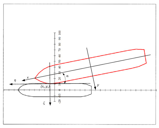 The situation and coordinate system are presented in Figure 5. A further step according to the formulas of [29]: the energy is calculated considering two cases, with sliding of the colliding vessel alongside the moored ship and with no sliding. The coefficient of friction (μ0) and restitution coefficient (e) are part of the model. The energy loss is expressed as in [30]:
