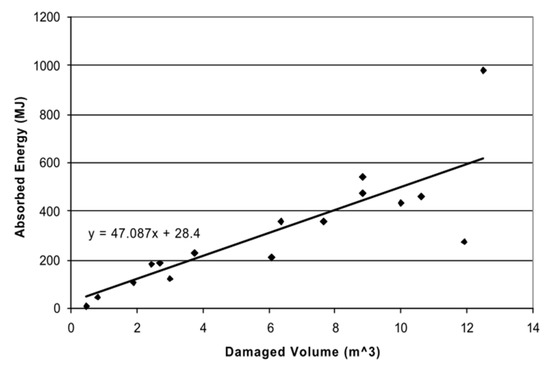 To determine the volume of material destroyed in a collision, two methods were used complementarily. For collisions of high-energy (>50 MJ), the modified Minorsky method was used, which was presented by [31] as the correlation presented in Figure 6 in the form of: