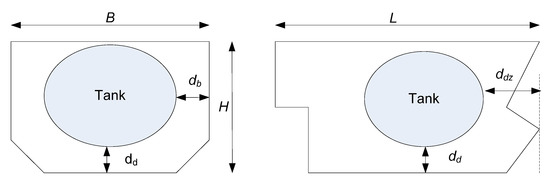 The key parameters for risk analysis—i.e., the distance of tanks from the sides, bottom and the bow—are shown schematically in Figure 7. Exceeding any of those parameters during the risk analysis results in unacceptable risk in this particular scenario.