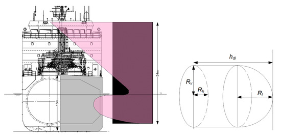 The shape of the bow part is assumed in simplified form as presented in Figure 8. The volume of the penetrating part could be expressed as a surface integral or calculated numerically as presented here according to a simplified bulbous bow expression as follows [29]: