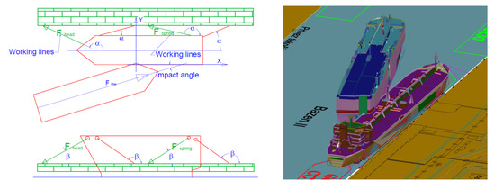 The resulting forces in mooring lines are Fhead and Fspring (Figure 11), calculated considering the horizontal and vertical position of the lines. According to the mooring configuration and the collision direction, the force of the collision is transferred to the mooring lines but also to the fenders on the banking side of the ship. In fact, part of the moving energy is converted to friction between the ship hull and fenders. The presented mooring model also considers the friction force resulting from the impact force in the y direction and the friction coefficient (0.5).