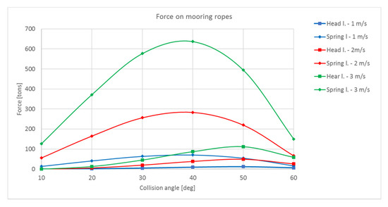 Table 4 shows the length of engaged mooring lines and their angles according to the ship mooring plan at the port terminal. The number of lines could vary and depends on the weather condition, but for steady conditions, the mooring configuration is as presented. The longitudinal force transferred from the colliding to the struck ship is transferred to the two headlines and two spring lines.