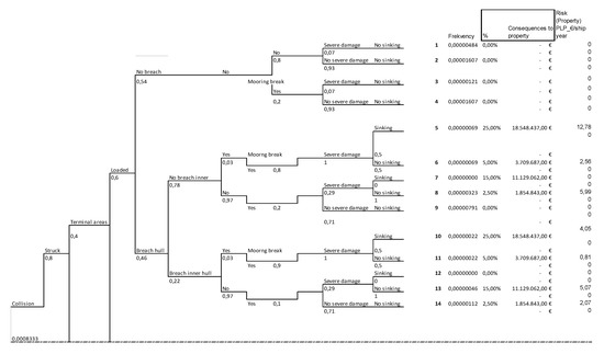 The risk evaluation applies the event tree for the collision event. The basic structure of the event tree is based on the MEPC report [31] and is used for the calculation of PLP. The assumption of property loss is based on Table 6 and the event tree for a collision is presented in Figure 13. Values in Table 6 are based on a total loss of a new ship, in this case a Panamax size, and divided in bands according to a damage extent. The similar approach was used in the IMO Formal Safety Assessment [23].