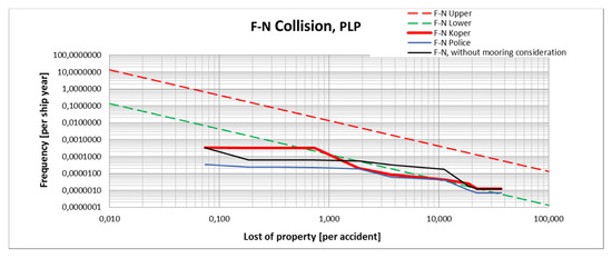 Figure 14 shows the economic aspect of the risk where the PLP graph above shows that the property losses, due to collision accidents, do not produce relevant economic risk to the port. It should be noted that risks should be considered together, especially those which are directly related with the cost benefit. The second is the risk curve for the police port that is lower than the Port of Koper only because the initial probability is lower than that calculated for the Port of Koper. Considering that the probability of mooring failure during the collision in port influences the risk curve in the range of 0.1 to 10 M EUR damage, the findings mean that the mooring break of a ship should be considered in the risk assessment, although in the analysed port the risk in both cases is within the acceptable area. The presented results quantitatively suggest the importance of a proper mooring arrangement assuming the probability of a collision in a terminal area.
