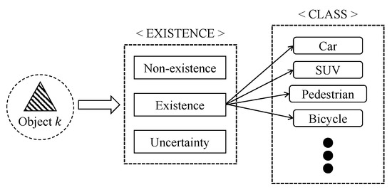 We determine the existence and class of an object by two consecutive stages of DS. Prior to classifying objects, we identify whether a detected object indeed exists or not, i.e., an inaccurate sensor can report that an object is detected even if there is nothing, and vice versa. Thus, we first identify the existence, and, if the existence of an object positively identified, second determine the class of the object. The process of the object information data fusion is depicted in Figure 1.