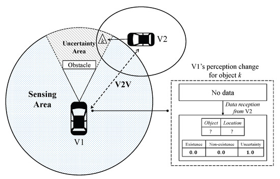 Below we define U or the “uncertainty” element, in a rigorous manner. There are two types of uncertainty. The first type is the uncertainty due to inherent limitation of a sensor. For example, a vision sensor cannot detect objects behind obstacles. As shown in Figure 2, the vehicle cannot recognize the existence of the completely occluded object unless a peer vehicle reports the object to that vehicle even if the object is within the sensing area. In this case, the confidence assignments by vehicle i about k is given by