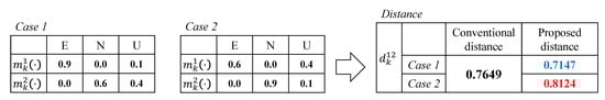 We illustrate an example of the proposed distance metric in Figure 3. In both cases, Observers 1 and 2 have the same Jousselme distance given by 0.7649 due to the symmetry of confidences of E and N. In our approach, given the weights as , , and , we obtain new distance for each case as 0.7147 and 0.8124, respectively. The result can be explained as follows. We assign high importance to “existence” by . For the case of and , the level of conflict between confidences is high, but Observer 1 is highly confident of existence, i.e., . In this case, it is regarded that two confidence vectors have a shorter distance than that by the conventional metric. Contrary to this, Observer 1 in case 2 has relatively low confidence in existence than case 1, i.e., . In spite of the same degree of conflict, by putting more emphasis on E, the dissimilarity between the confidences become greater. Therefore, we obtain the distance in case 2 given by , which will affect the result of data fusion. Next, we explain how the existence of the object is determined based on the proposed distance.