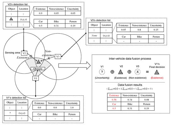 In order to leverage sensed data from multiple vehicles in real-time, we require a data fusion system with low complexity and high reliability. In multisensor systems, there is uncertainty caused by inaccuracy of sensors or complicated sensing environment [15]. In this respect, the “Dempster–Shafer theory of evidence (DS)” [16,17] is a widely used evidence theory to comprehensively fuse multisource information including uncertainty. It does not require any priori information and requires a simple calculation where the outcome can be reinforced as more data become available [18,19,20].