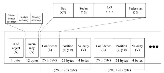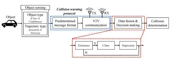 For autonomous vehicles, it is necessary for the embedded collision warning system to quickly perceive the surrounding environment and make decisions. In Figure 5, we illustrate an overall architecture of the proposed collision warning system. We summarize the components of the system as follows. Each vehicle obtains raw data from the equipped sensors such as cameras and radars. Through the object detection process, the object class and its confidences are extracted from the raw data. The trajectory information such as location and velocity are tagged to the object information in real-time. Next, we propose a compact message format for communications to achieve low latency. The encapsulated messages is shared via V2V communication, which provides high data rates and reliability such as DSRC. Next, the aforementioned data fusion algorithms are applied to determine the states of the detected objects. Based on them, the future trajectories of the detected objects are estimated by Kalman filter with cosine effect compensation [59,60]. From the estimated trajectories, the proposed system warns an imminent collision. In this paper, we mainly consider collision warning protocol of the system in detail.