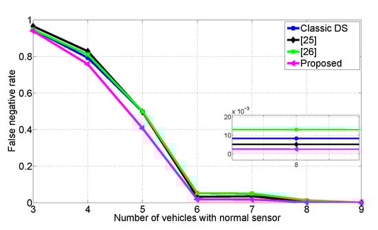 We demonstrate how the confidences change as data sources are added in Figure 16. Especially, we compare the performance of the proposed scheme with the conventional weighted data fusion method exploiting Jousselme’s distance. For abnormal states of V2 and V3, we assume that they have high confidence in “nonexistence” about V1, and the other vehicles are set to have confidence in existence of V1 as 0.7 and 0.9, respectively. In Figure 16a,b, we plot changes of confidences for the proposed and existing weighted DS schemes, respectively. The detailed parameters and experimental results are presented in Table 4. As the data are received sequentially, we can find that the confidence in existence is changed in both figures. However, under the baseline scheme, the final confidence on existence is 0.48, which in turn makes V2 decide “nonexistence”. Contrary to this, the proposed scheme shows 0.58 confidence in existence, thus V2 can recognize V1 successfully. From this result, it is shown that the proposed scheme can reduce the false negative error as compared to the conventional data fusion method.