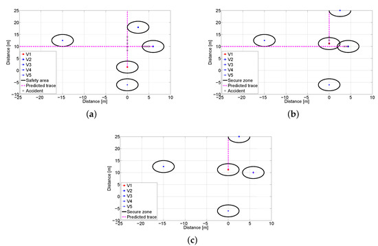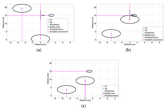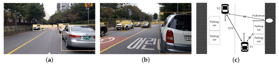 An environment modeling for this scenario is shown in Figure 17. As shown in Figure 17b, it is predicted that the accident will happen after 0.7 s. However, under the proposed system, V2 can stop as soon as recognizing movement of the V1 as in Figure 17c.