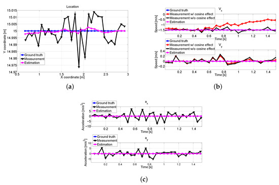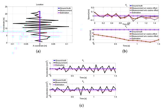 We compare the measurements and estimation of V1 in Figure 15. Due to the dynamics of V1, the angles between nearby vehicles are changed, which results in inaccurate measurements as shown in Figure 15b. However, Figure 15a–c demonstrates that we obtain precise estimation values by the proposed scheme, and the predicted collisions are avoided.