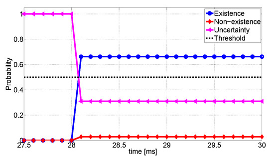 The elements in (18) are the weighted confidences of E, N, and U. We define the set of elements of as . Next, we can apply the classical DS procedure in (3) to fuse for times [25,26,35,47]. The algorithm for existence calculation is presented in Algorithm 1.