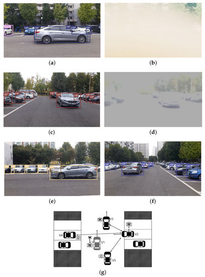 The video images captured at vehicles and detection results: (a) The original image at V2. (b) The blurred image at V2. (c) The original image at V3. (d) The blurred image at V4. (e) The front view of V4. (f) The front view of V5. (g) Top view illustration.