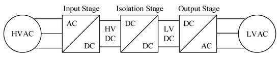 Due to the randomness and intermittence of DGs, the power flow direction of an SST will change frequently, and the voltage across the port of each stage will suffer fluctuation, flicker, sag, and interruption [12], which brings serious damage to electric motors and, precisely, operated power electronic instruments and other power equipment [13,14]. Integration of DGs requires a comprehensive control of the SST. As for the multi-stage SST, traditional control at each stage is independent: the input stage is responsible for the voltage stability of the high-voltage DC (HVDC) bus, and the isolation stage is responsible for the voltage stability of the low-voltage DC (LVDC) bus [15,16,17,18]. In [15], an all-SIC device-based multistage SST was established, where the input stage of the SST adopted a front-end converter (FEC) and the isolation stage was with a DAB. The HVDC bus voltage and LVDC bus voltage were set as the control target of FEC and DAB, respectively. The control strategies of FEC and DAB do not interact with each other, which lacks collaborative operation between them. A global system control structure is described in [16], which can handle the different power flow directions and DC voltage unbalance using battery energy storage. The global control strategy is based on independent control strategy, and DC voltage fluctuation can be suppressed with assistance of the battery contribution, but it may increase the investment. In [17], a SiC-based multiple active bridge was chosen as the isolation stage of the SST to reduce the number of power devices, and a first order approximation-based mathematical model was analyzed, which helped to simplify a voltage balance controller design. The balance control of submodule DC voltage was also researched in [18] to solve the problem of unbalanced submodule voltage after using multilevel converter modules. The addressed control strategy focused on the input stage of the SST without collaboration among different stages. However, such independent control strategy ignores the inherent differences in the power response speed between different stages, which is prone to cause power difference on both sides of the DC-link capacitors and exacerbate the DC voltage fluctuation. Many efforts have been made to solve this problem. A coordinated control strategy is put forward in [19], to reduce the voltage fluctuations of the LVDC bus, that combines the isolation stage and the output stage. However, it focuses on the dual active bridge cascaded with an inverter (DABCI), which does not consider the input stage in a complete SST. The coordinated control in three stages of the SST should be further studied. Based on a simple SST model, an energy feed-forward scheme for the isolation stage and a direct power feed-forward scheme for the rectifier are proposed in [20], which improve the dynamic performance of the DC-link voltage during load fluctuation. A data-driven coordinated controller architecture for a multiple active bridge-based SST is proposed in [21]. This controller optimizes the target value by collecting and analyzing the global information of the SST, and improves the MVDC-link and LVDC-link voltage quality of the SST under grid-side abnormal conditions.