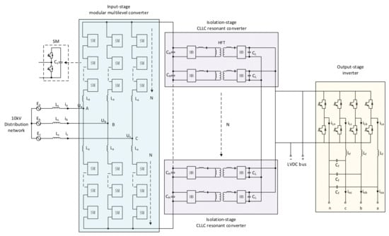 The multi-stage SST commonly contains three stages: input stage, isolation stage, and output stage, as shown in Figure 1. The input stage mainly adopts a modular multilevel converter (MMC) and a cascaded H-bridge (CHB) [7]. A dual active bridge (DAB) converter is often employed as the isolation stage. At present, the main factors affecting the practical application of SSTs are low-energy transmission efficiency and high cost. The efficiency of an SST can reach 93.72% with a CHB-type input stage [8], which is relatively low for practical application. However, the required number of power electronic switches and high-frequency transformers can be reduced by using an MMC as the input stage, which can significantly reduce the switching losses of power transistors and the cost of the SST [9] as well. Under the voltage level of the distribution network, power loss of the SST isolation stage is usually much higher than that of the input stage. Before extensive commercial use of power devices such as SiC and GaN, CLLC resonant converters can effectively solve for the inherent inefficiency of the DAB converter, whose conversion efficiency exceeds 96% [10]. In [11], a 5 kV CLLC resonant converter prototype was built and its efficiency reached 97%. In this paper, the efficiency of the CLLC resonant converter can reach beyond 98% at the rated power.