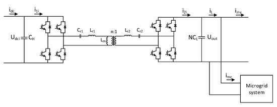 The topology of a single submodule of the CLLC resonant converter is shown in Figure 4, where is the input current of the HVDC link; and are the input and output DC voltages of the submodule; and are the input and output currents; is the outlet current of submodule i, and is the outlet current of the overall input-series–output-parallel (ISOP) CLLC resonant converter; , and , are the resonant capacitors and inductors on the primary and secondary sides; is the magnetic inductor, which can be integrated inside the HFT; n is the transformation ratio of the HFT; represents the equivalent parallel capacitance of the LVDC link; and and are the input currents of the output stage and local DC microgrid.