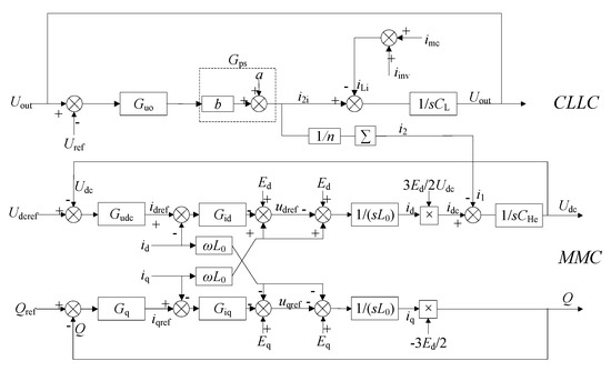 From Figure 4, Figure 5 and Figure 9b, the voltage response functions of the SST DC links to the CLLC load current under the independent control can be given in Equation (12), where is equal to and is the equivalent inductance on the AC side of the MMC.