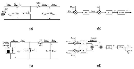 As mentioned previously, the topology of the grid-connected DC microgrid system is shown in Figure 3. A boost chopper circuit is usually adopted as the interfacing converter for PV to realize the maximum power point tracking (MPPT) control [23,24]. The topology and control diagram are shown in Figure 6a,b. For the energy storage system, which includes batteries and super capacitors, the interface converter must realize a bidirectional power transmission, so the current reversible chopper circuit is usually used. Common control methods include constant DC voltage control and voltage droop control. The topology and control diagram are shown in Figure 6c,d.