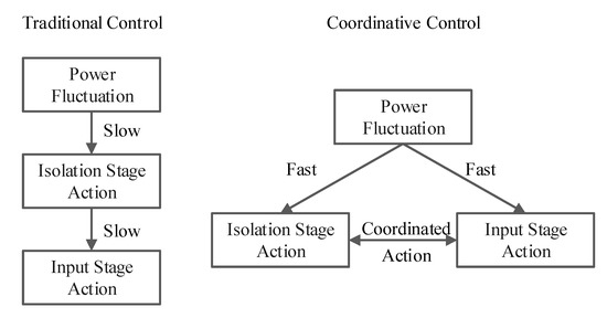With respect to the problems existing in the independent control, a hierarchical coordinative control strategy for the SST and microgrid composite system is proposed. In general, the hierarchical coordinative control mitigates the local microgrid’s external power fluctuation and realizes a joint action of the MMC and the CLLC during the dynamic process. The comparison of control logic between independent control and coordinative control is shown in Figure 8.