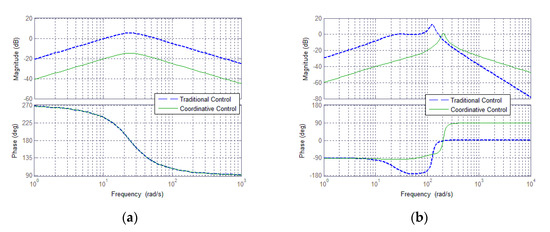 The system simulation parameters are shown in Table 2. According to Equations (12) and (13), the Bode diagrams of the disturbance response functions can be obtained, as shown in Figure 10. From this figure, it can be seen that the coordinative control strategy proposed in this paper can significantly improve the low-frequency amplitude gain, indicating that this coordinative strategy has a better suppression for the DC bus voltage fluctuating during a same dynamic process. The Bode diagram of Equation (14) is similar to that of Equation (12), since the coefficient acts on the numerator, and so it is not repeated here.
