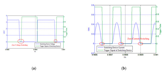 The steady-state working waveform of the CLLC: (a) the zero-voltage-switching waveform of the primary-side switching device; (b) the zero-current-switching waveform of the secondary-side switching device.