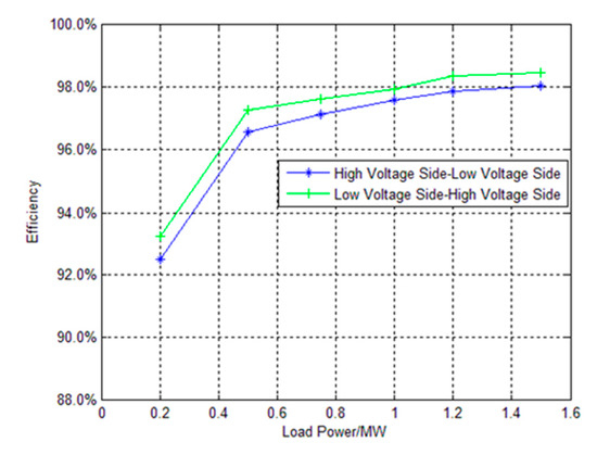 - At present, the main factors affecting the practical application of SSTs are high cost and low energy transmission efficiency. The adopted input-stage MMC instead of cascaded H-bridge can significantly reduce the required number of power electronic switches and high-frequency transformers in the SST, thus reducing the system cost. As for the isolation stage that accounts primarily for SST power losses, the efficiency of the CLLC resonant converter adopted in this paper can reach above 98% at rated power, which is greatly improved, compared with the DAB converter, whose efficiency is only about 90%.