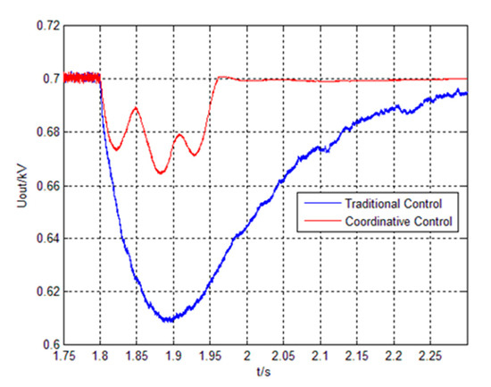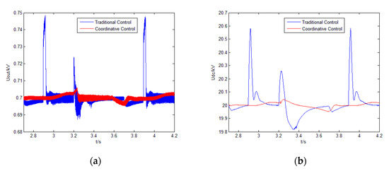 At 1.5 s, the DC microgrid is connected to the system, the PV output is 0.3 MW, and the DC load is 0.2 MW. Starting from 2.7 s, the output power of the PV supply in the microgrid fluctuates continuously in a wide range, and the variation rule is 0.3 MW–2 MW–0.3 MW–2 MW. In this process, the power flow direction of the SST will change frequently under independent control. Figure 13 shows the response of the LVDC and HVDC bus voltages. It can be seen from the comparison that the hierarchical coordinative control strategy proposed in this paper can quickly stabilize the bus voltage and greatly improve the power quality in the dynamic process. Using traditional control strategy, the maximum transient voltage changes of the LVDC and HVDC links are about 47 V and 580 V, respectively. However, under the proposed coordinative control strategy, the DC bus voltage has almost no fluctuation.