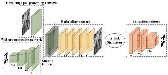 First, the host image pre-processing network maintains the original image’s resolution and is composed of one convolutional layer (CL) with 64 filters whose strides are the same as 1. Since the embedding network’s output should be similar to the host image, the input image, this network should not damage the host significantly. Thus, it consists of only one CL with 3 × 3 filters. Nevertheless, it uses 64 filters (it means 64 channels are produced) to extract as many characteristics of the host image as possible.