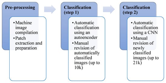 To construct the image library, it was necessary to categorize all the patches generated in the pre-processing stage. Manual sorting of such a large number of images can be time-consuming and tedious and, therefore, prone to possible human error. However, the scientific literature offers studies which have shown that validation or rejection through a binary option of a proposed classification is much faster and more reliable than conventionally assigning a category to the image [29]. To generate our classification, an automatic labeling algorithm based on an autoencoder-type neural network was designed, along with clustering algorithms [30].