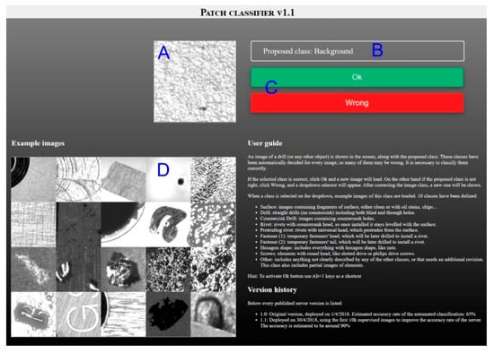 Graphical interface for patch classification purposes. (A) the interface presented the patch image to be classified; (B) the category proposed by the automatic labeling algorithms; (C) it offered the user two options: accept the proposed label or reject it; (D) the application presented images of all the categories.