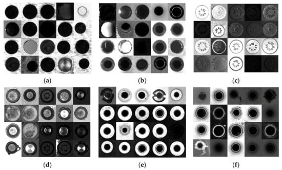 Furthermore, the feature vectors extracted by the autoencoder were ordered with a clustering algorithm (k-means). This algorithm groups the vectors in a predetermined number of categories so that the variance of the points in the same category is minimized [32]. In our study, a set of points with 64 classes (k = 64) was analyzed, and they were subsequently and manually assigned to all of the nine previously defined categories. After assigning all of the images to categories, they were manually reviewed using a classification interface (Figure 4).