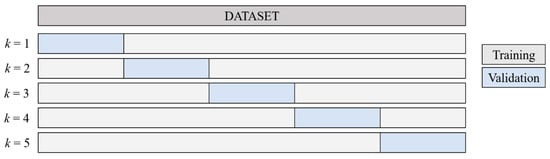 Our dataset of 126,000 images was randomized and structured following a five-fold cross-validation scheme (Figure 8), where the set was split into five equal parts so that one of the portions would be used during each iteration to validate, and the remaining four would be used to train. Therefore, the training/test ratio was 80:20. This way, the category distribution influence on the training data could be analyzed.