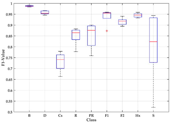 The training of our network showed a categorical accuracy for the validation set within the interval [94.5%, 96.5%] with an average of 95.7%. The accuracy, recall and F1-value were calculated on each defined category (Table 1). Moreover, the statistical distribution of the F1-values is shown in Figure 9. These values were averaged over the five iterations, and the confidence interval encompassed 95% of the samples (2-sigma).