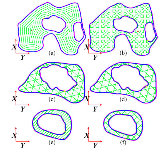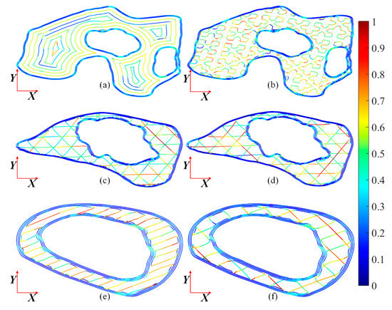 Six kinds of infilling patterns of femur (previously shown in Figure 1) at three layers with incremental , where (a) is concentric with , and ; (b) is cross with , and ; (c) is triangle with , and ; (d) is tri-hexagon with , and ; (e) is line with , and ; (f) is grid with , and .