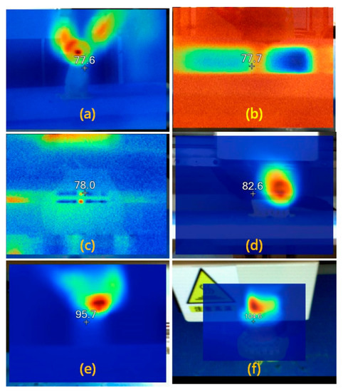 Thermographs during temperature rise process. The incremental temperature of (a–f) are, respectively, 77.6 °C, 77.7 °C, 78.0 °C, 82.6 °C, 95.7 °C, 104.6 °C.