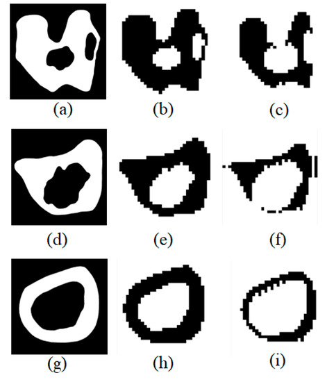 Initialization probability of customized layer before defect prediction using convolutional generative adversarial network with incremental , where (a) is concentric with ; (b) is cross with ; (c) is triangle with ; (d) is tri-hexagon with ; (e) is line with ; (f) is grid with .