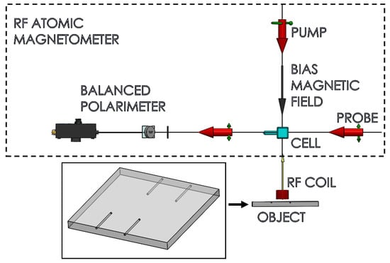 In this paper, we evaluate the performance of an rf atomic magnetometer in various types of NDT measurement scenarios involving a concealed defect. Our main goal is to identify the optimum coupling between the rf field and the object, i.e., optimum operational frequency of the sensor, for detecting defects concealed by a conductive barrier or throughout the object’s volume. The detection of objects has partially demonstrated the efficacy of NDT with an rf atomic magnetometer through conductive and ferromagnetic barriers [19]. The low operating frequency of the magnetometer enables the penetration of the rf field through the barrier. In the cited experiment, the rf primary field source and the sensor are located on opposite sides of the barrier, which might be impractical for in-the-field measurements. In contrast, we are exploring a more versatile detection geometry, Figure 1, over a frequency range where the skin depth spans the object thickness. In addition, it should be noted that studies of the sensor performance for various frequencies, rather than just a single frequency, could address the problem of operating the magnetometer at frequencies near noises in the ambient magnetic field.