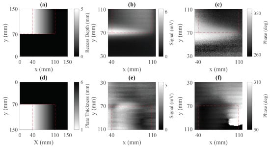 (colour online) The measured change of the amplitude (b,e)/phase (c,f) of the rf signal over a mm area of a - thick aluminium plate with a single recess, whose depth changes from to (right to left). Images (b,c) are recorded with the recess on the top surface, while in (e), (f) the recessed surface is facing away from the sensor. Change of the recess depth, and inversely the plate thickness, is shown in (a,d), respectively. To record images (b,c,e,f), the same plate was simply flipped by . Red dashed line marks a position of the edge of the recess.