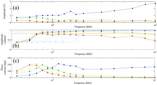 The amplitudes and contrasts of the profiles recorded in the presence of the barrier shows a broad maximum. The frequency for which the maximum contrast is observed depends on the thickness of the barrier (2–3 kHz for -thick barrier, –2 kHz for -thick barrier).
