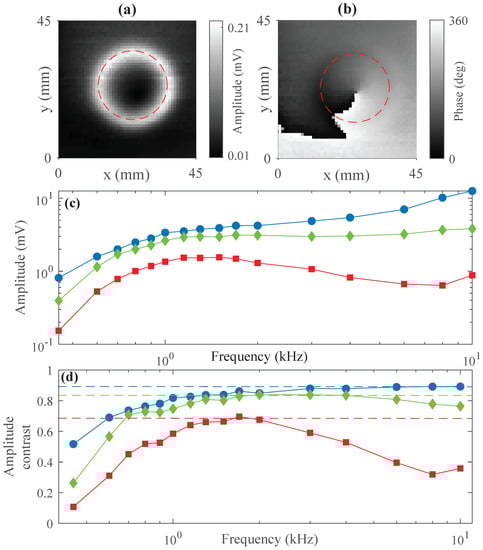 As mentioned before, the amplitude image recorded in the self-compensated configuration represents the measurement of the amplitude components of the secondary field parallel to the surface of the object (plate). For the ideal case, these components have non-zero values only in the immediate vicinity of the edge. Consequently, the amplitude image of the circular recess has a form of a ring profile, Figure 4a, while the phase of the rf signal shows a vortex centred on the recess, Figure 4b [24]. The red dashed line marks the position of the recess edge in Figure 4a,b. As mentioned before, we approximately know the position of the defect, and it has been marked for guides for the eye. The main focus of this work is on the relationship between the defect signature and operating frequency, not on the accurate mapping of the detect. This vortex in the phase image is visible across the whole range of studied frequencies and the following analysis will concentrate only on changes in the amplitude images. We characterise the recess signature similarly to that of the edge. The amplitude of the recess signature is defined as , with reflecting signal amplitudes at the top of the profile and in the background of the image. In order to take into account the imperfect compensation of the rf field that introduces inhomogeneities in the measured profile and background amplitudes, we define as an average of the profile amplitude along the circumference of the ring. The value of was calculated as an average of the image background, i.e., average of 10 columns and rows each that make up the edge of the image.