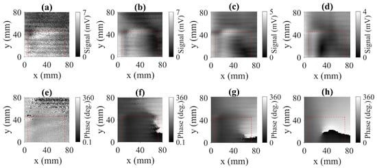 Figure 6 shows the amplitude (a)–(d) and phase (e)–(h) images of the aluminium plate containing a recess with variable depth. The plate is flipped such that the recess is on the surface which faces away from the rf coil, i.e., the inner surface [depicted in Figure 2d]. The area of this recess is highlighted by the dashed red square. The signature of this measurement is related to the thickness of the plate, as opposed to the depth of the recess. Within the highlighted area, the thickness of the plate gradually increases from at to at ; and has a constant thickness along to . At the recess edge (), there is a sharp change in thickness to . The images are recorded for four values of the operating frequency: kHz [(a) and (e)], kHz [(b) and (f)], kHz [(c) and (g)], and 10 kHz [(d) and (h)]. In contrast to the profiles recorded in the amplitude image where the recess is on the outer surface [shown in Figure 2a], the measured amplitudes produced by the edge and the tilted area of the recess for the inner surface (Figure 6a–d) have a similar value.