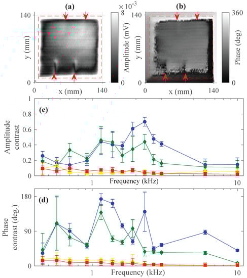 Figure 7c shows the dependence of the magnetometer frequency on the amplitude contrast () while (d) shows the phase contrast, . Consistent with results shown in Figure 4d, the frequency dependence of reaches a broad maximum within 1 kHz–2 kHz range for of the cavities that lie (blue dots) and (green diamonds) under the object surface. The dependencies for cavities that are 2 (yellow triangles) and (red squares) deep indicate the presence of a maximum for frequencies below 1 kHz. The spatial extent of the profiles representing the cavity edge is defined by the coil diameter, lift-off distance, operating rf frequency and conductivity of the plate. Since the size of the cavity is comparable to the diameter of the rf primary field coil, the profiles from the opposite edge of the cavities overlap. This overlap results in a reduction of the observed contrast with respect to the values shown in Figure 4d [23]. Imperfections in rf field cancellation are visible in the relatively large variation in the frequency dependence of the phase contrast, . Nevertheless, the general trend mirrors that of the frequency dependence of the amplitude contrast. The advantage of is the large dynamic range of the defect signatures measured, even for frequencies outside the optimum range, i.e., 1 kHz–2 kHz, where the maximum value of the and are reached.