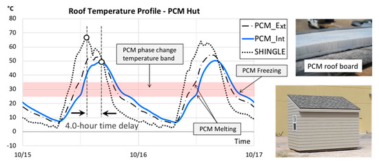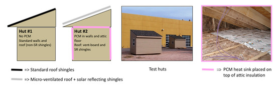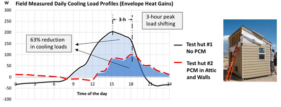 The amount of thermal insulation in the huts was the same. The test hut containing PCM also had reflective (cool) roof shingles and a layer of microchannel board installed on top of the roof deck and both test huts had very similar air-leakage rates, as confirmed with blower door testing.